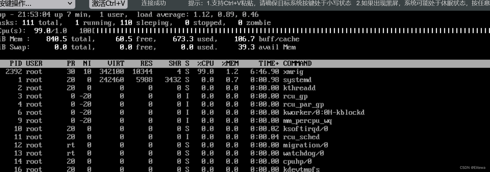 登录后使用 top 指令查看CPU进程